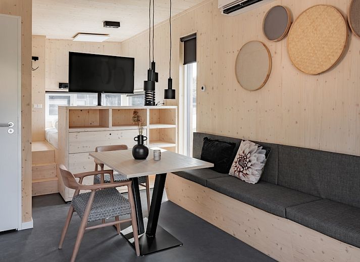 Cette Tiny House indépendante peut accueillir jusqu'à 2 personnes. La maison de vacances est aménagée de manière intelligente pour offrir beaucoup d'espace. Le salon dispose d'un coin salon avec télévision. La cuisine compacte est équipée, entre autres, d'un réfrigérateur-congélateur, d'une cafetière, d'un four à micro-ondes combiné, d'une bouilloire et d'un lave-vaisselle. Vous dormez dans un lit-coffre confortable avec 2 lits simples. Si vous allumez la télévision, vous pourrez profiter de vos séries et films préférés au lit également. La salle de bains est équipée d'une douche à l'italienne, d'un lavabo et de toilettes. La Tiny House dispose d'une terrasse partiellement couverte avec un canapé et une table à manger. La Tiny House est située dans une partie du parc de vacances où les voitures sont interdites. Les jours d'arrivée et de départ, vous pouvez charger ou décharger votre voiture à proximité de votre logement. Ensuite, vous pouvez garer votre voiture dans le parking central. Pendant votre séjour, vous pouvez utiliser gratuitement le wifi. La Tiny House est développée de manière durable, ne consomme pas de gaz et est équipée de panneaux solaires et d'une pompe à chaleur. Bon à savoir : la télévision a des fonctions de streaming. Cela vous permet de regarder des applications de votre téléphone ou de votre tablette directement sur l'écran de télévision. Pour ce faire, vous utilisez vos propres comptes.