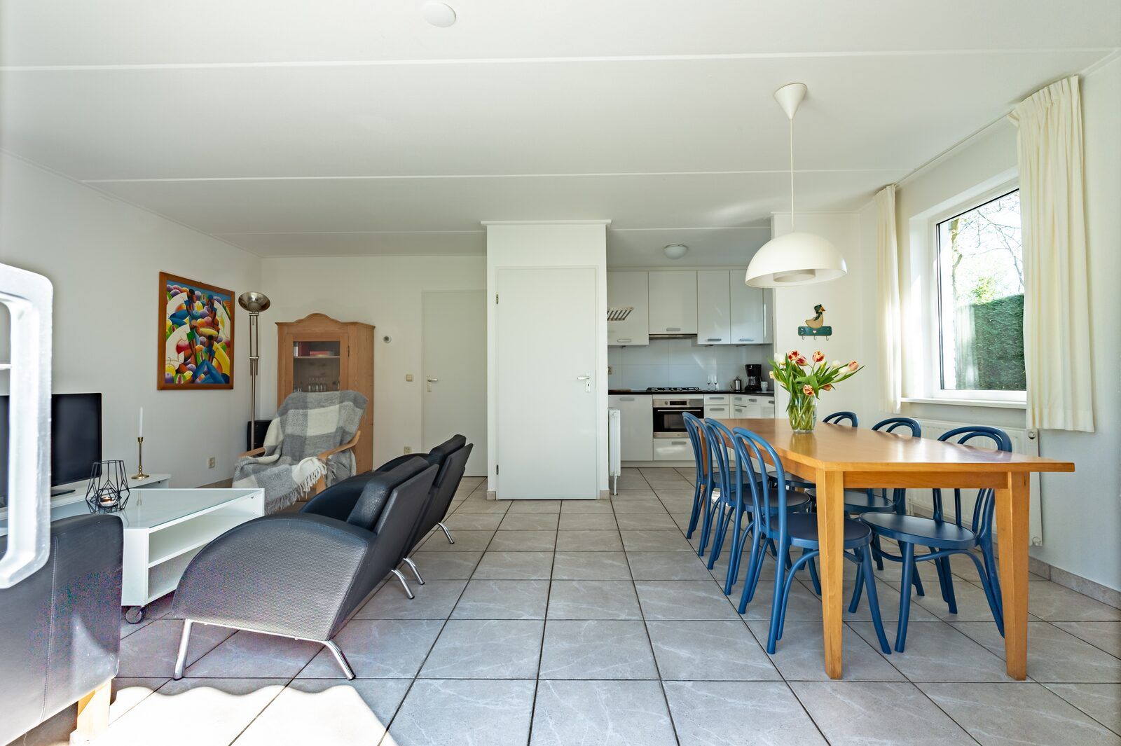 Le salon avec cuisine ouverte est charmant et lumineux et est orienté vers le sud. Une porte coulissante avec marques donne accès au jardin dense et abrité et à la terrasse avec des meubles de jardin confortables et deux chaises longues. Dans le salon, vous trouverez un coin salon confortable avec une télévision à écran plat. La luxueuse cuisine ouverte est entièrement équipée d'appareils modernes de qualité. Entre autres, vous trouverez un micro-ondes combiné et un lave-vaisselle.