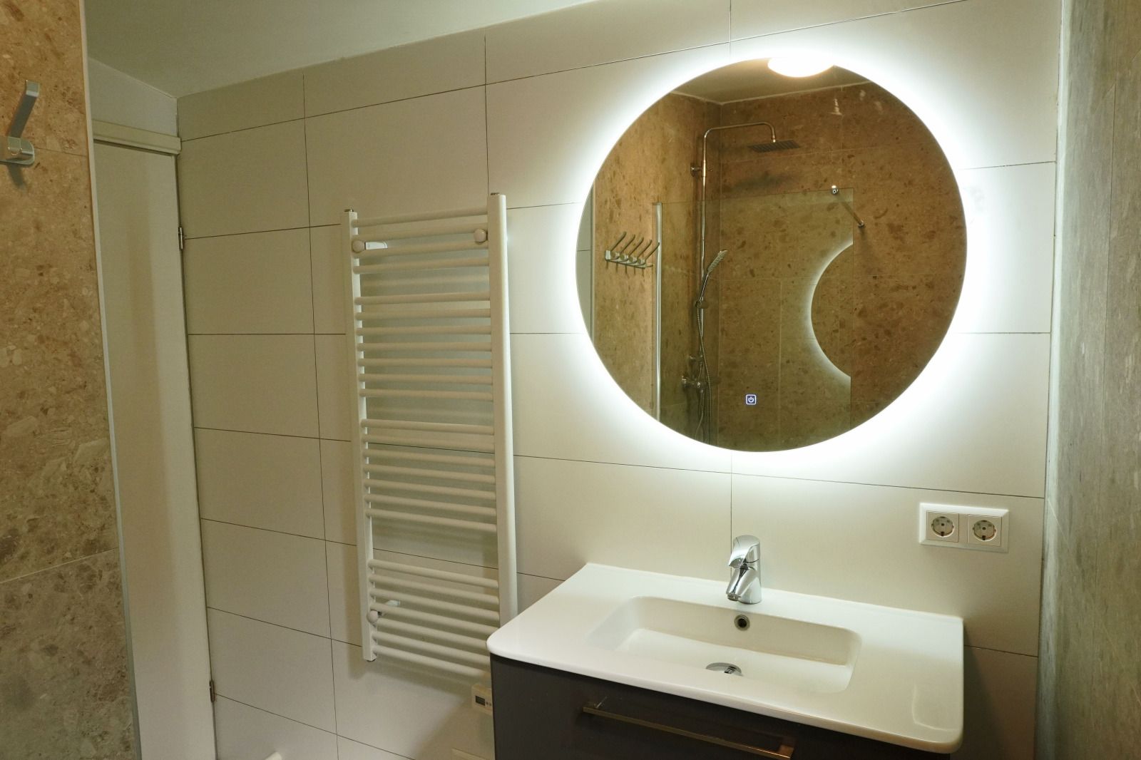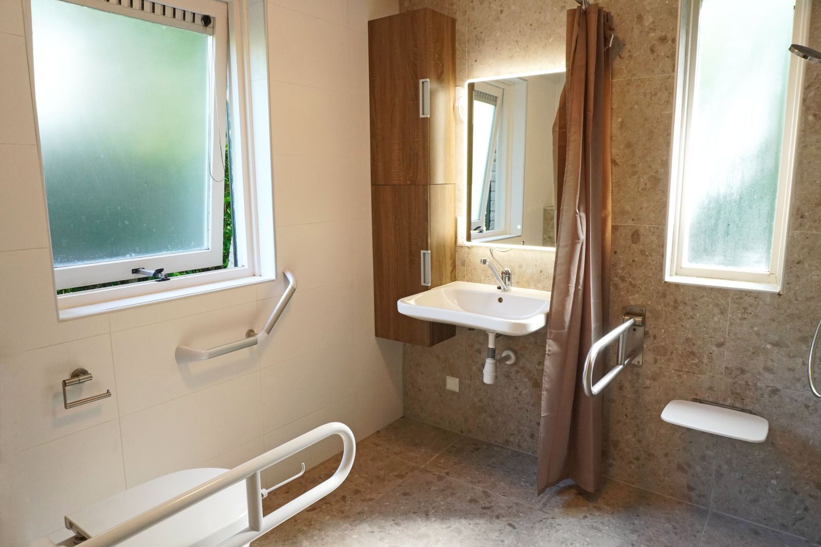 Le rez-de-chaussée comprend deux chambres et deux salles de bains. L'une des chambres est équipée d'un lit surélevé. La salle de bains adaptée dispose d'une douche avec une chaise de douche avec accoudoirs, d'un lavabo et de toilettes avec supports. L'autre salle de bains est équipée d'une douche solaire et d'un sauna.