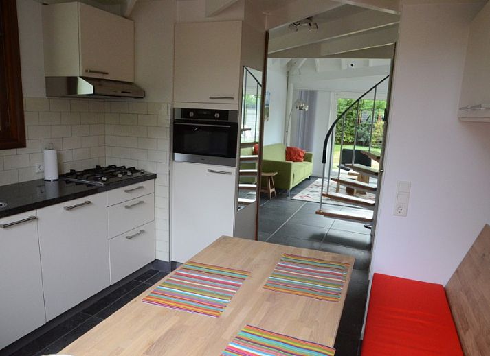 La cuisine est équipée d'un réfrigérateur, d'une plaque de cuisson à 4 feux, d'une cafetière à filtre, d'un four à micro-ondes et d'un lave-vaisselle. Il y a une table à manger avec une banquette fixe et une banquette amovible.