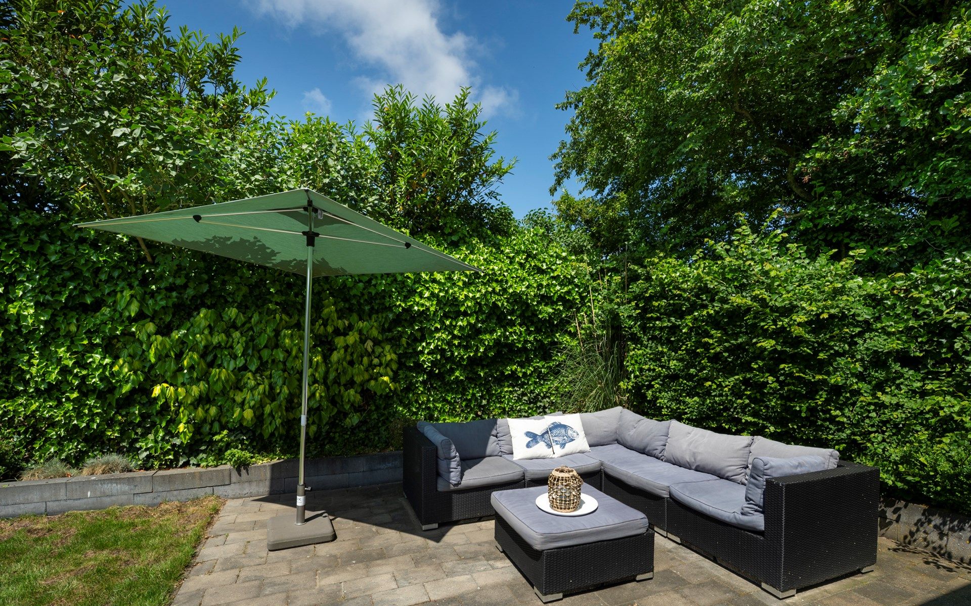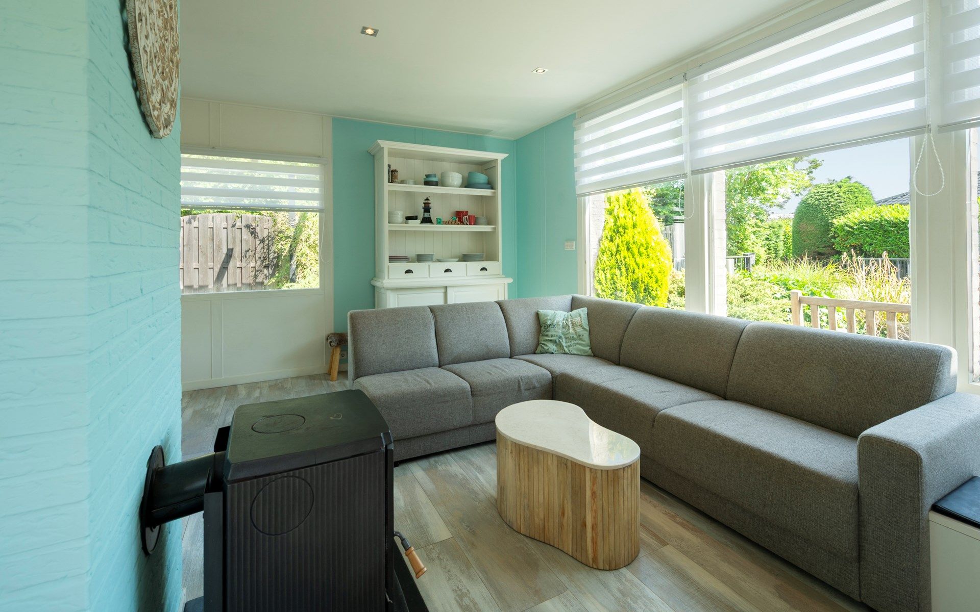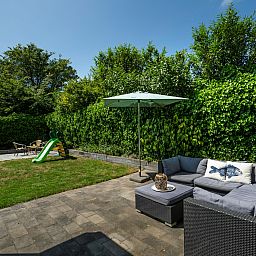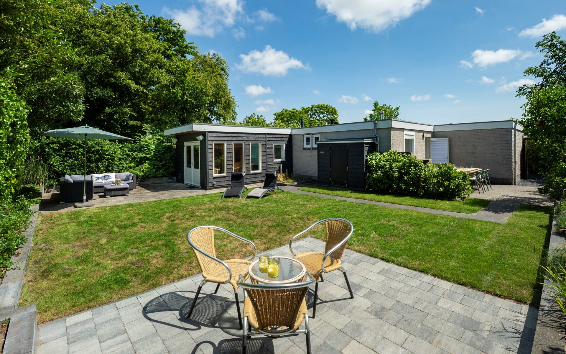 Le grand jardin arrière clos dispose de deux terrasses avec de beaux meubles de jardin et d'un joli salon où l'on peut profiter du soleil et de la musique diffusée par les haut-parleurs. Au fond du jardin se trouve un sauna infrarouge dans une pièce séparée où vous pouvez vous asseoir et vous détendre. Il y a également une douche extérieure luxueuse. Vous trouverez également une petite terrasse dans le jardin avant, deux places de parking et une remise.