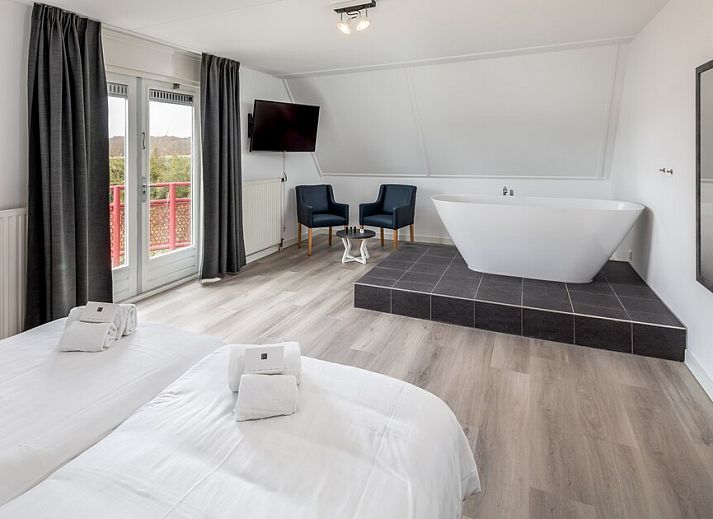 Ce bungalow est indépendant et peut accueillir 6 personnes. La salle de séjour spacieuse dispose d'un coin salon avec une télévision intelligente. La cuisine ouverte comprend une machine à café et un four à micro-ondes combiné. 1 chambre est située au rez-de-chaussée et les 2 autres chambres se trouvent au premier étage. L'une de ces chambres dispose d'un balcon privé et toutes les chambres sont équipées de lits simples à ressorts. La salle de bains au premier étage est équipée d'une baignoire, d'une douche à l'italienne et de toilettes séparées. Le jardin est clôturé et dispose d'une terrasse avec un salon. Le bungalow dispose également d'un sauna infrarouge.