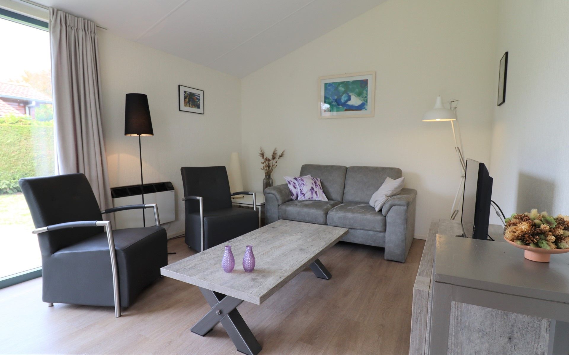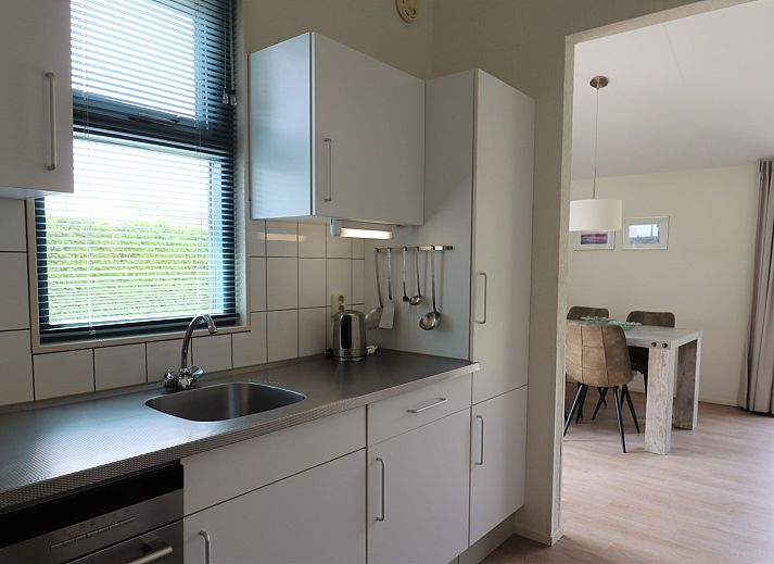 Le bungalow dispose d'un salon moderne avec télévision et d'un coin repas confortable. La cuisine ouverte est équipée d'un four, d'un micro-ondes et d'un lave-vaisselle. Il y a deux chambres, l'une avec un lit double (lits jumeaux) et l'autre avec deux lits simples. La salle de bains est équipée d'une douche et d'un lavabo. Les toilettes sont séparées. Un lit bébé et une chaise haute sont disponibles dans la maison.