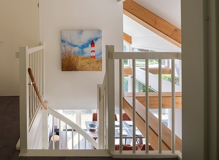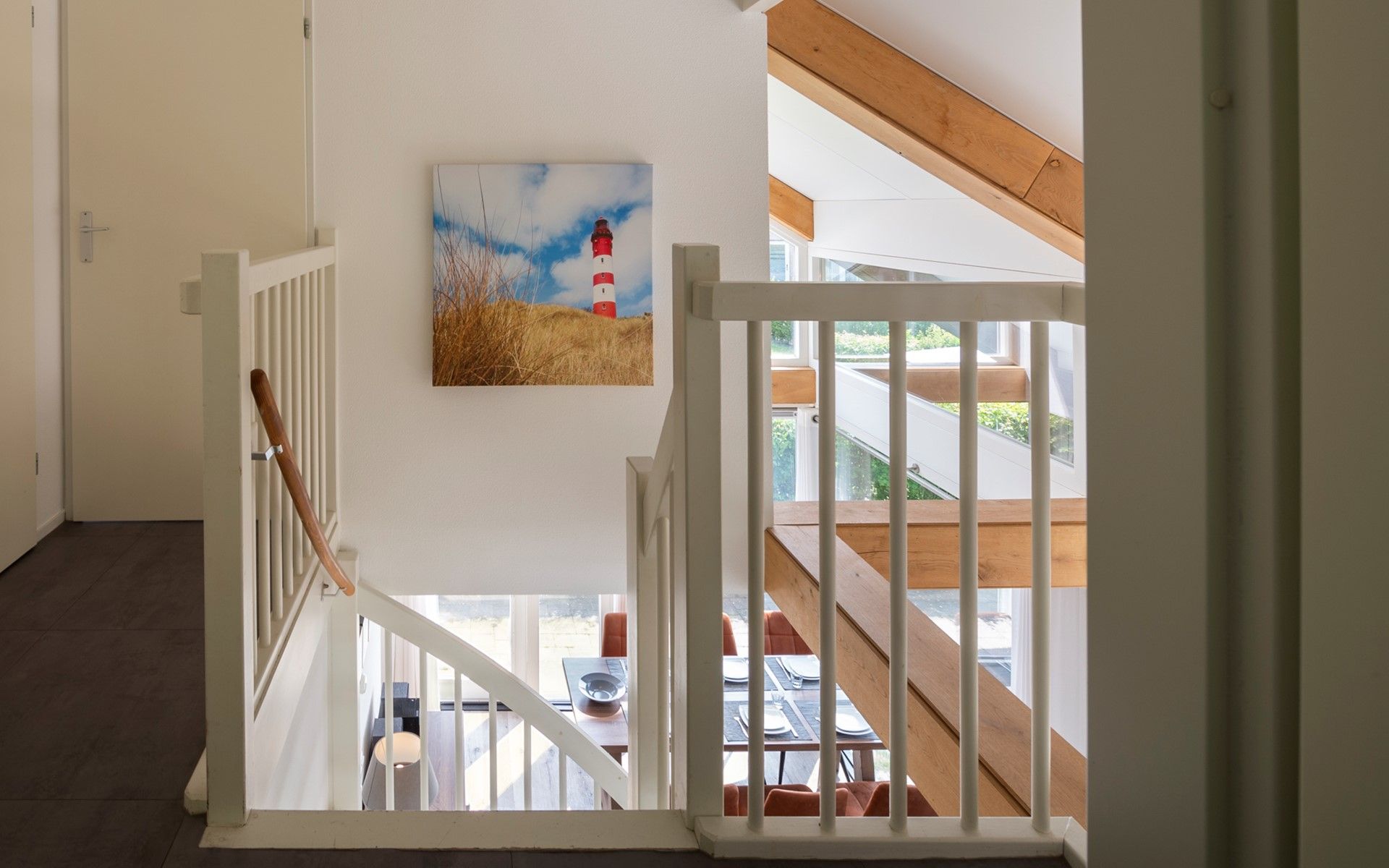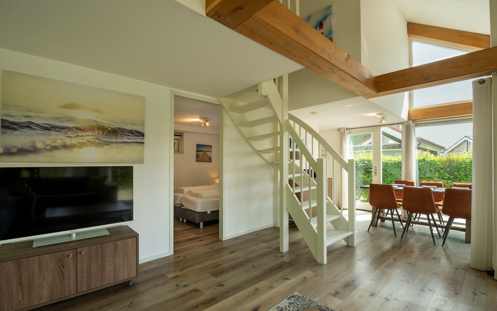 La maison moderne et lumineuse est joliment meublée et se caractérise par des éléments côtiers et de plage. Le salon, avec son coin repas attenant et sa cuisine ouverte entièrement équipée, crée une atmosphère agréable. Le rez-de-chaussée comprend également une salle de bains attenante et des toilettes séparées. À l'étage, vous trouverez deux chambres, une douche supplémentaire et des toilettes séparées.