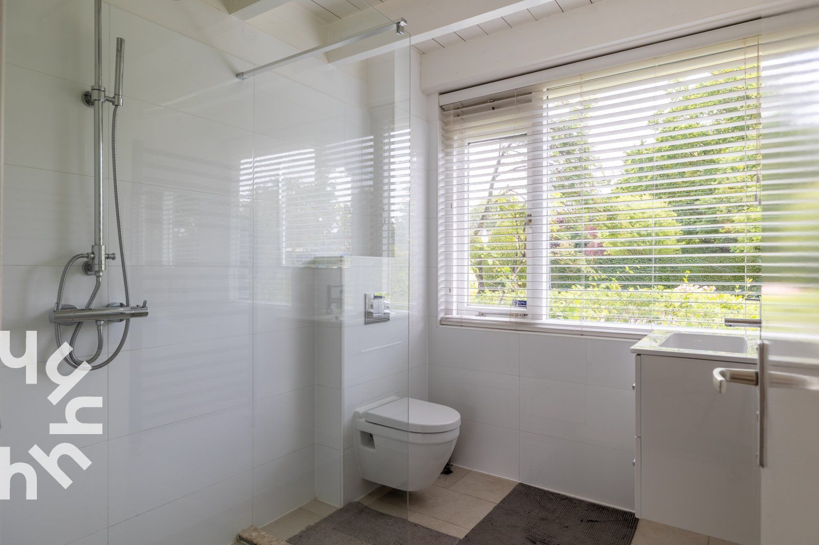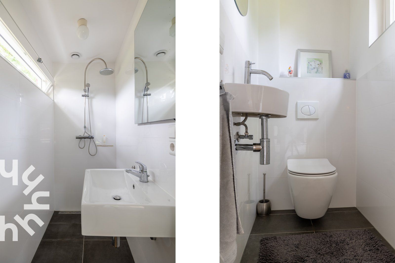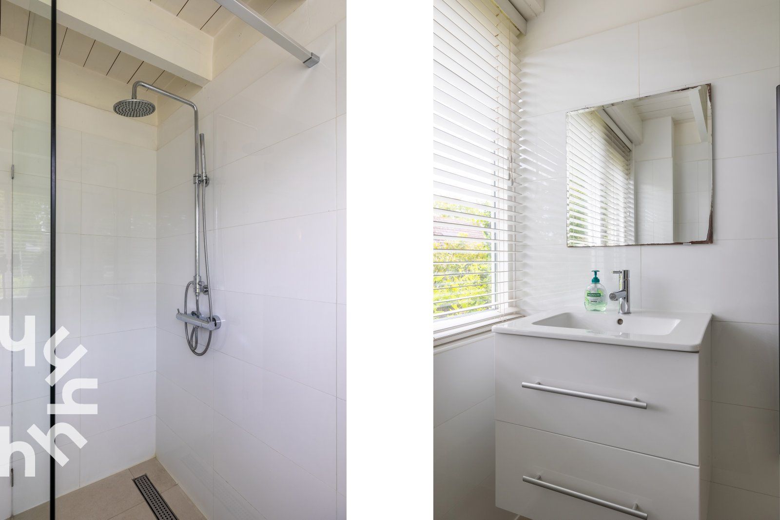 Au rez-de-chaussée se trouve également une luxueuse salle de bains avec douche à l'italienne, toilettes suspendues et lavabo, ainsi que des toilettes séparées.