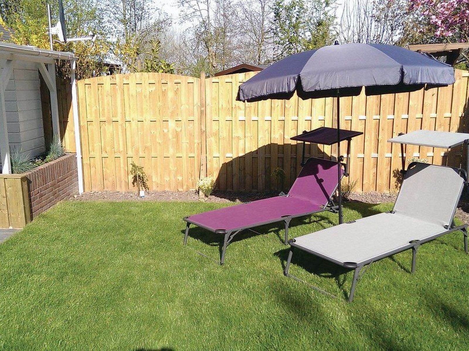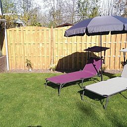 The approximately 16m2, partly covered terrace has garden furniture, parasol, two deck chairs and a barbecue. The garden is fenced and therefore also great for children and dogs. View of a large grass playing field with a small children's playground, football pitch, volleyball court, etc.