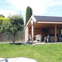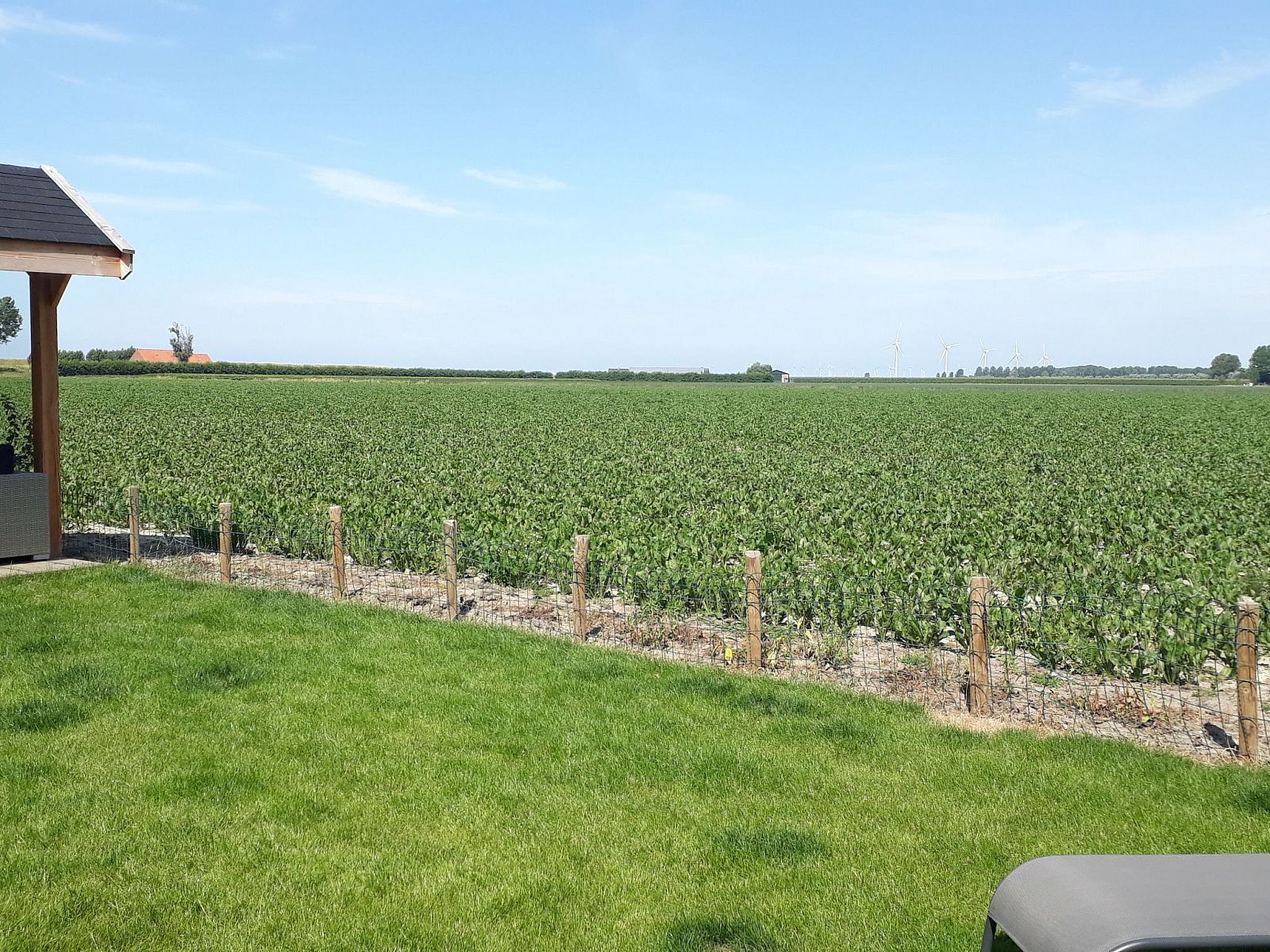 The approximately 30m2 terrace has garden furniture and a barbecue. In the garden you will find a cosy gazebo with lounge set to hang out in. Two deck chairs are available in the garden for sunbathing. The garden is fenced and therefore perfectly suitable for children and dogs. View of your own garden with kilometres of panoramic views across the fields and, with the right wind, you can see the sails of the boats passing behind the dike.