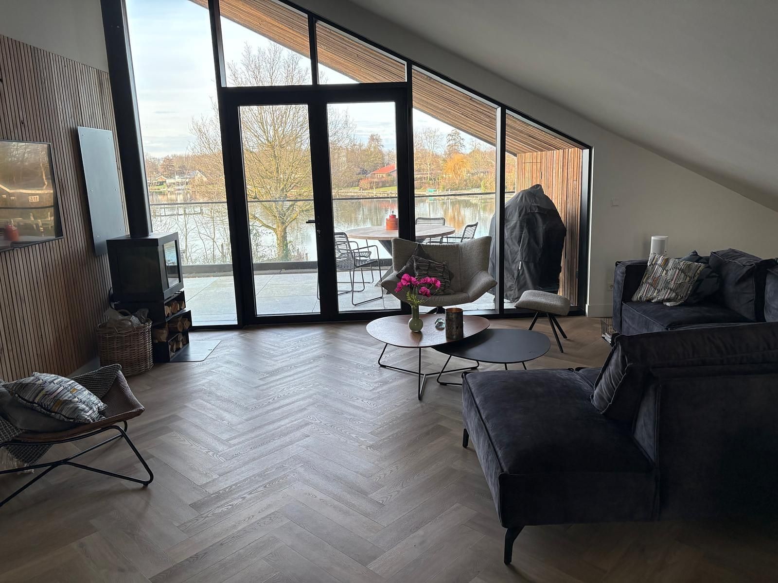 Le salon lumineux et confortablement aménagé se trouve au premier étage de la villa. Il dispose d'un coin salon confortable avec une télévision connectée, une cheminée à bois et une vue imprenable sur l'eau. Depuis le salon, vous avez accès à la terrasse avec une grande table à manger ronde et un barbecue fixe. L'endroit idéal pour passer de longues soirées d'été à déguster un bon repas accompagné d'un verre de vin.