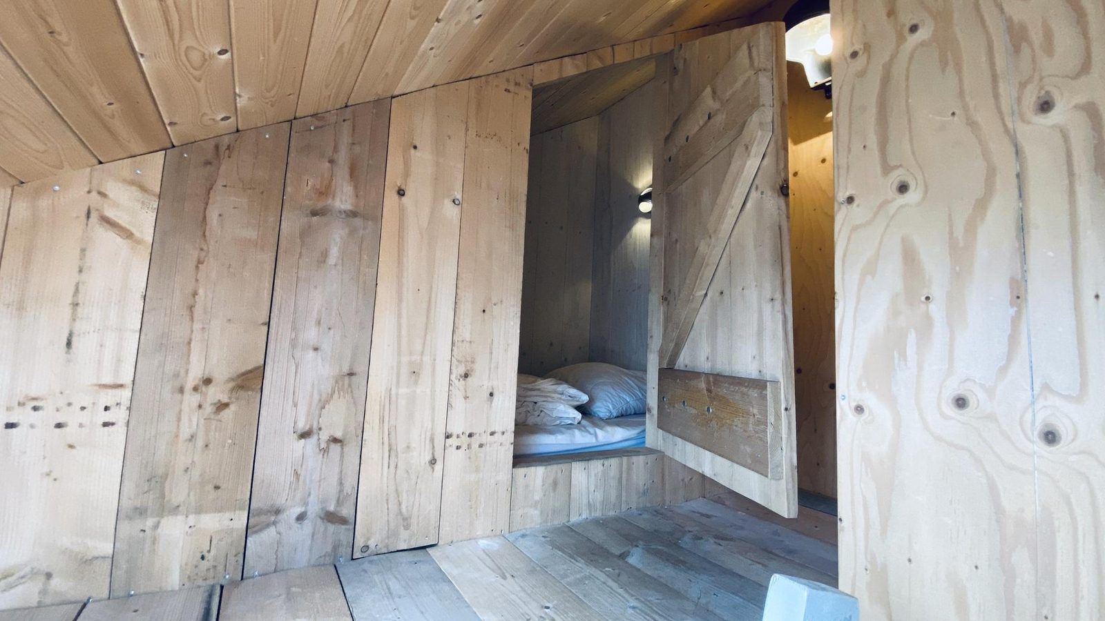 Au-delà du lit-coffre, on pénètre dans la cuisine ouverte qui jouxte le salon. Là encore, l'ambiance bois d'échafaudage a été choisie. Un détail agréable est que l'éclairage est construit à partir des anciens abreuvoirs qui proviennent de l'étable convertie, dans laquelle la maison est située.
