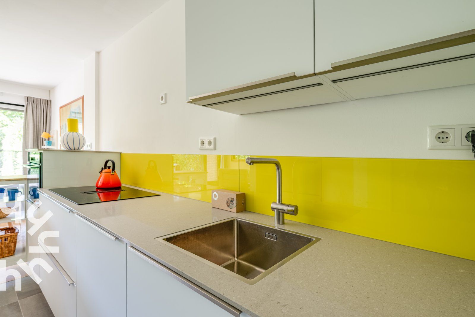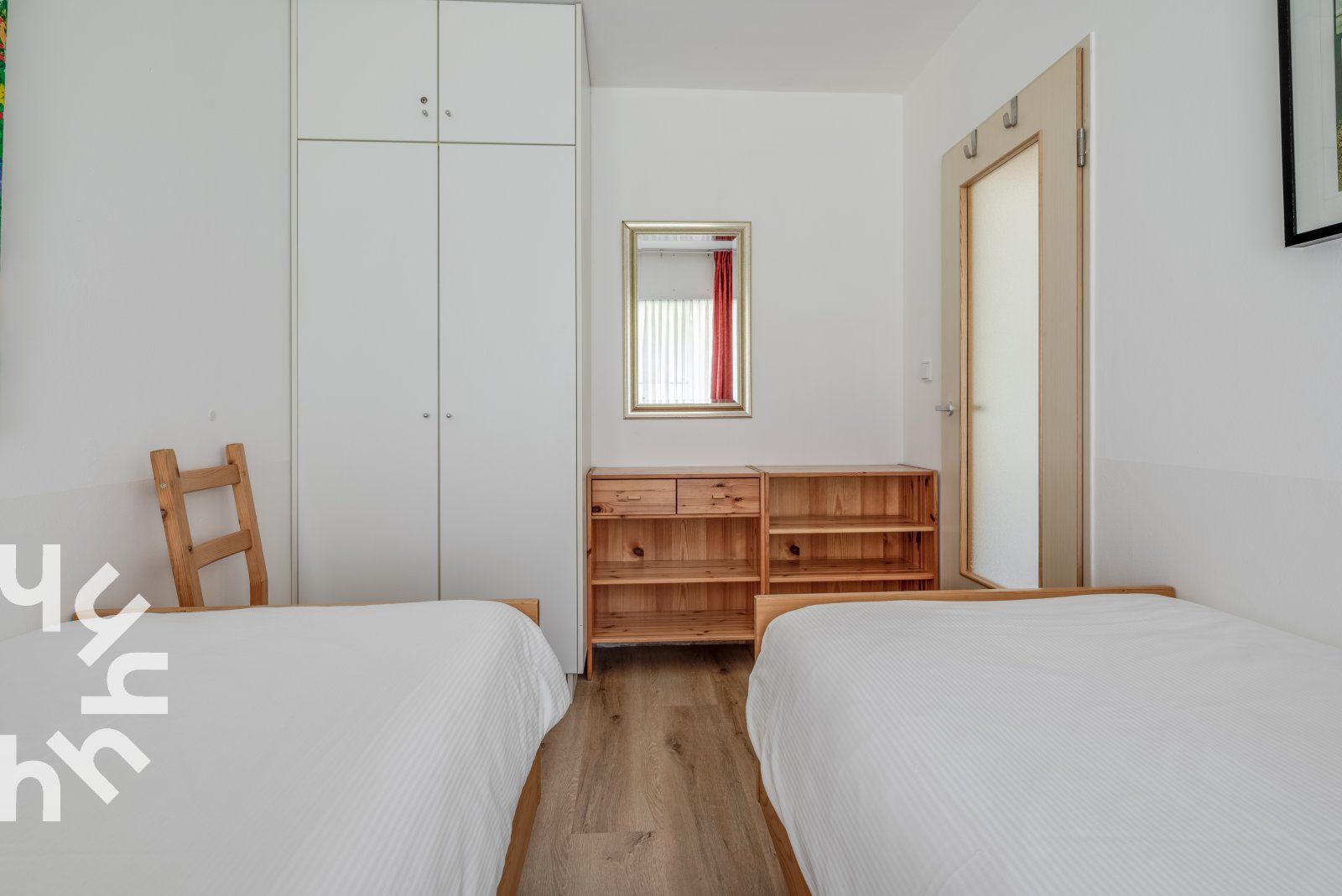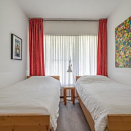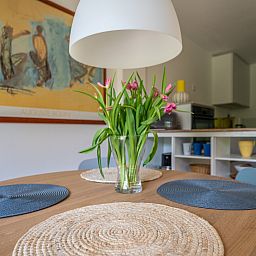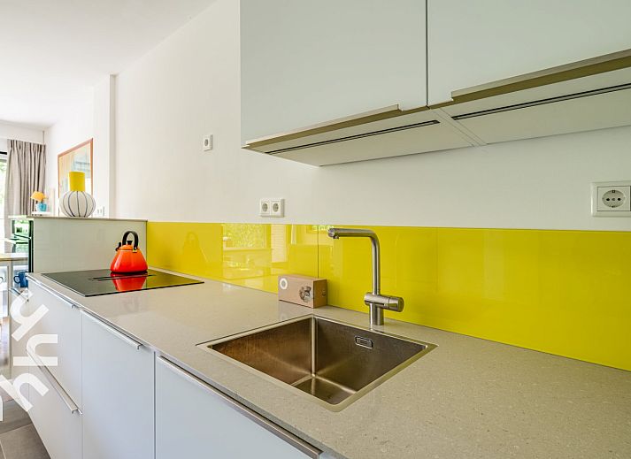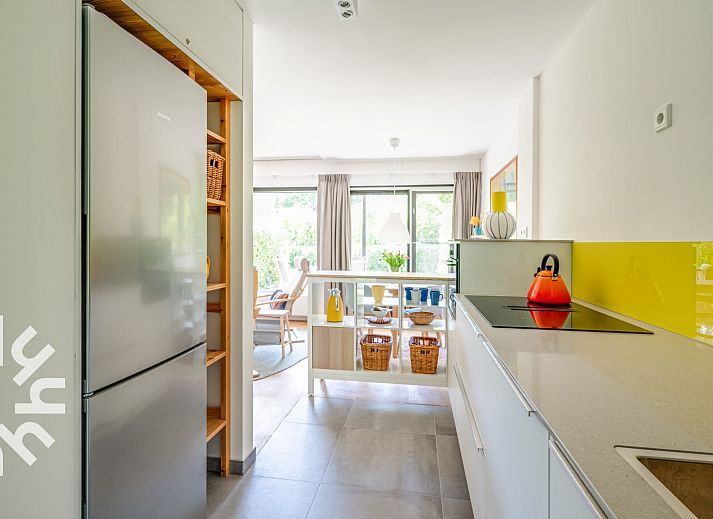 Vous entrez dans le hall et traversez la cuisine ouverte pour arriver dans le salon. Le salon dispose d'un canapé, de deux chaises et d'une table à manger avec quatre chaises. La cuisine est équipée d'un réfrigérateur, d'un congélateur à trois tiroirs, d'un lave-vaisselle, d'une plaque de cuisson à induction avec hotte intégrée, d'un four à micro-ondes combiné et d'une cafetière à filtre. La chambre à coucher dispose de deux lits simples. La salle de bains soignée est équipée d'une douche, d'un radiateur sèche-serviettes, d'un lavabo et de toilettes. Il y a une place de parking privée. Autour du complexe d'appartements se trouve un jardin commun que vous pouvez utiliser.