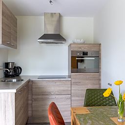 Le studio dispose d'un salon avec deux fauteuils confortables, d'une télévision par satellite, d'un coin repas et du chauffage central. Le studio est équipé de deux lits simples à ressorts électriques. En outre, la cuisine ouverte vous offre toutes sortes d'équipements tels qu'une plaque de cuisson à induction, un four à micro-ondes combiné, un grille-pain, une cafetière à filtre et un lave-vaisselle. La salle de bains est équipée d'une baignoire et d'une douche, d'un lavabo avec miroir chauffant et de toilettes.