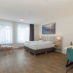 Passez vos vacances dans le luxe et le confort. Les studios de luxe offrent le confort d'une chambre d'hôtel et la commodité d'un studio. Un lit double confortable à sommier tapissier vous permettra de vous endormir paisiblement après une longue journée de vacances. Chaque suite dispose d'un coin salon et d'une kitchenette. Celle-ci est équipée d'une bouilloire, d'un réfrigérateur avec compartiment congélateur, d'un lave-vaisselle, d'un four, d'une cafetière à filtre et d'une machine Nespresso. Il y a également une salle de bains spacieuse avec double lavabo, douche, sèche-cheveux et toilettes.