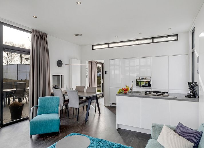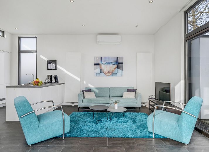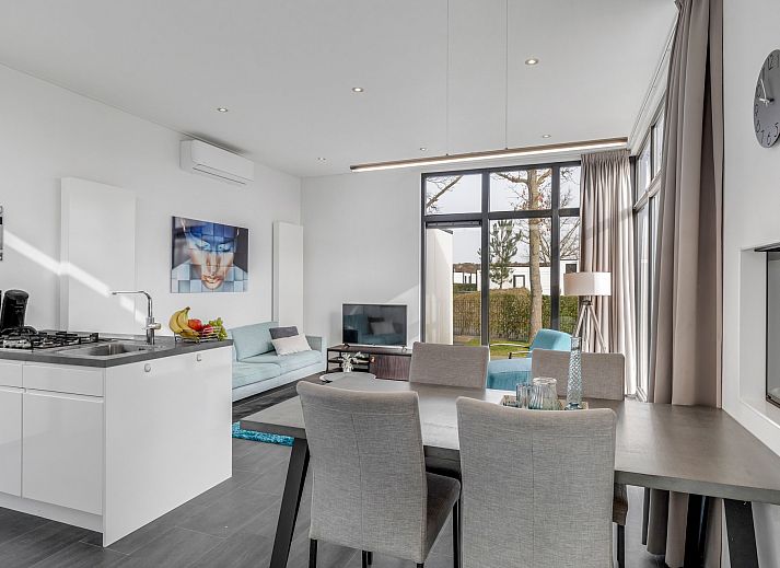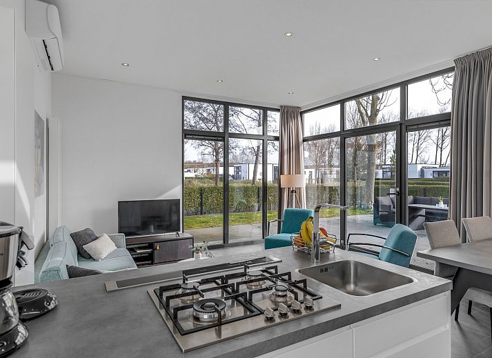 Bij binnenkomst valt direct de lichte en ruimtelijke woonkamer op. De grote raampartijen zorgen voor veel natuurlijk licht en een open sfeer. De woonkamer staat in directe verbinding met de moderne open keuken, die is uitgevoerd met een stijlvol kookeiland. De keuken is compleet uitgerust met diverse inbouwapparatuur, waaronder een combimagnetron, koelkast met vriesvak, vaatwasser en een gaskookplaat. Voor extra comfort is de woning voorzien van airconditioning, waardoor het binnenklimaat in elk seizoen aangenaam blijft.