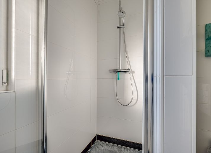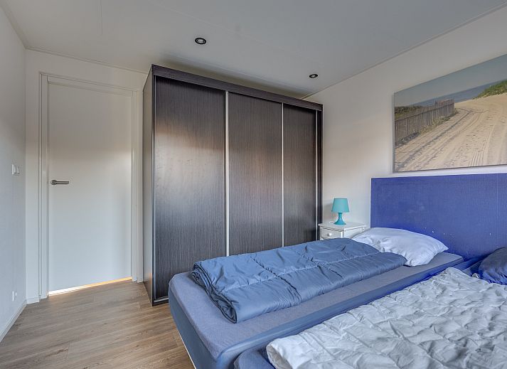Le hall dessert les toilettes séparées ainsi qu’un espace supplémentaire pour la chaudière. Il donne également accès à la salle de bains et aux trois chambres. La salle de bains, moderne et entièrement carrelée dans des tons blancs et gris, comprend une grande douche avec porte en verre et deux vasques avec meuble. Le chalet compte trois chambres, dont deux équipées de grands placards intégrés. La troisième chambre dispose d’un meuble de rangement en hauteur. Toutes les pièces sont soignées et lumineuses, parfaitement adaptées à une résidence de vacances en bord de mer.