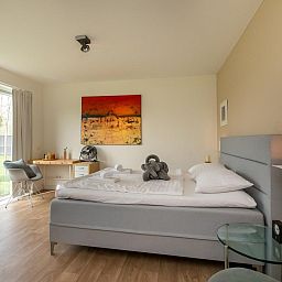 Le logement dispose de trois chambres, dont une au rez-de-chaussée avec un lit double (180 x 200 cm), des tables de chevet avec lampes de lecture, une grande armoire et un bureau. Les deux autres chambres se trouvent au premier étage, accessible par un escalier ouvert dans le salon. La première chambre dispose également d'un lit double (180 x 200 cm) et de plusieurs armoires, tandis que la deuxième chambre est équipée de deux lits simples (90 x 200 cm) et présente une touche nautique unique. Une deuxième salle de bains avec baignoire et douche se trouve également à cet étage. Plaisirs extérieurs et équipements
