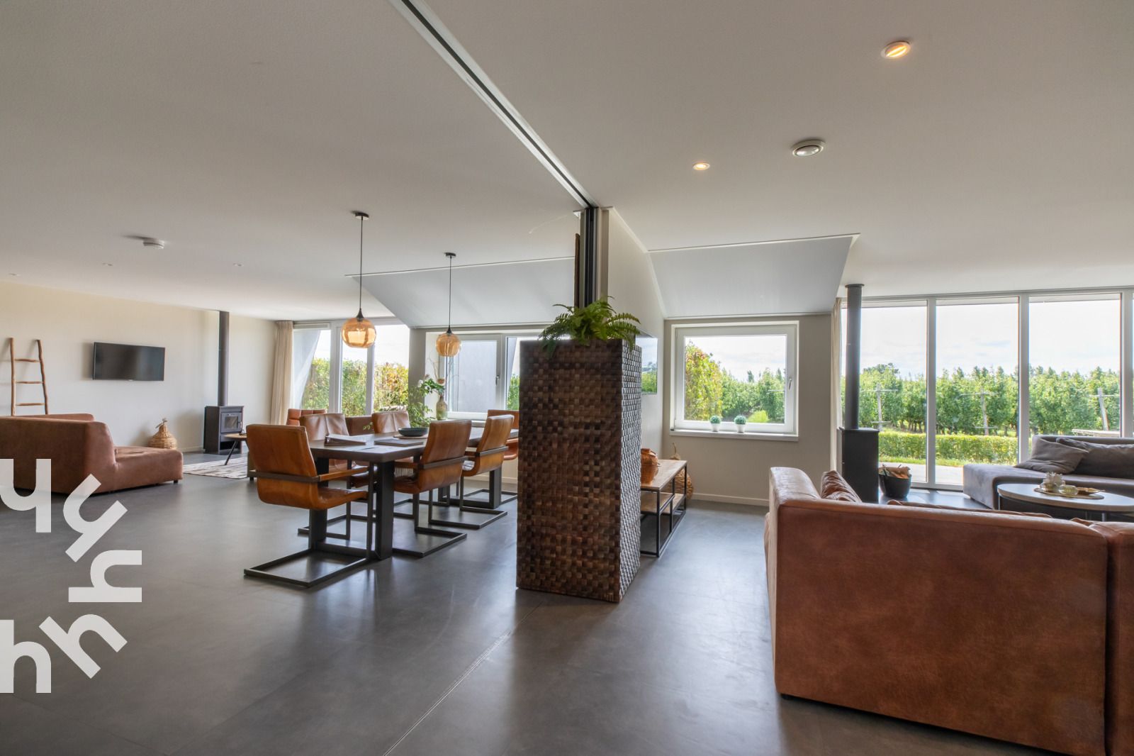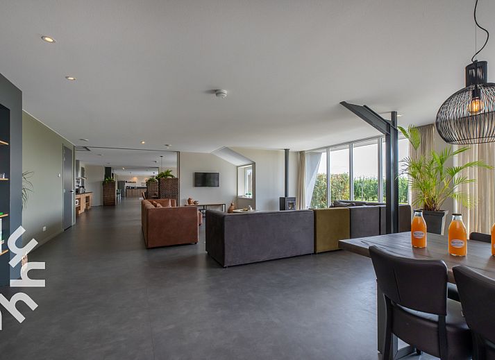 Le salon spacieux et moderne comprend une salle à manger et un coin salon avec un poêle à bois et une télévision. Par les portes-fenêtres, vous accédez à la terrasse avec un canapé et une vue sur le verger. La cuisine ouverte comprend un lave-vaisselle, un micro-ondes, une cafetière, une cuisinière à quatre feux, un réfrigérateur et une bouilloire. Il y a quatre chambres à coucher avec un lit double à ressorts (2.10) et une cinquième chambre à coucher avec un lit double à ressorts et des lits superposés. Il y a une salle de bains avec double douche, double lavabo, toilettes et baignoire, ainsi qu'une salle de bains avec double douche et deux autres toilettes.