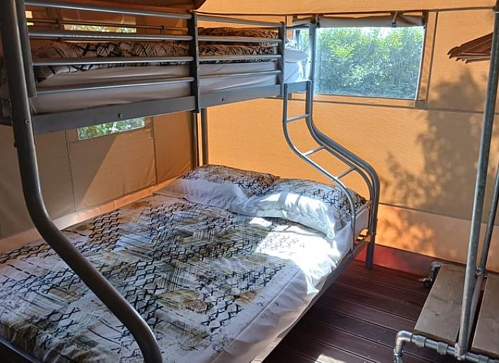 Dans la tente safari, il y a deux compartiments de couchage avec un sommier (160×200) et dans l'autre compartiment de couchage, il y a un lit superposé dont le lit inférieur est de 140×200.