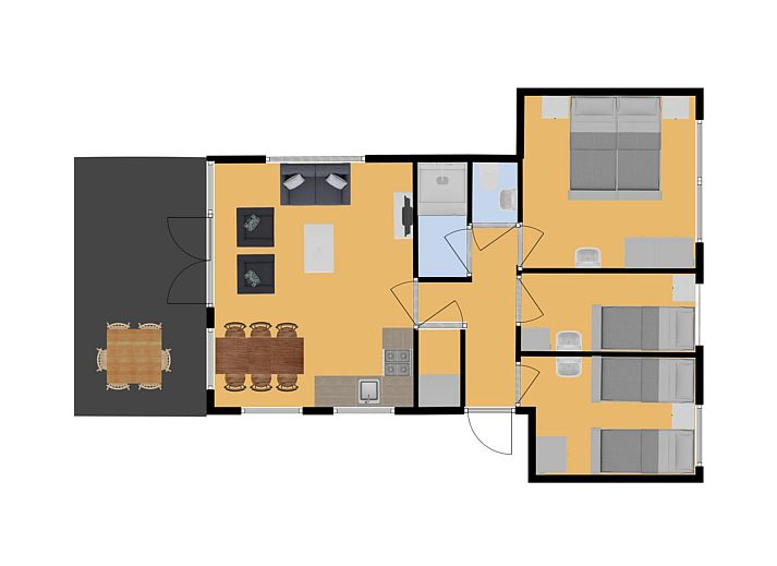 Ce bungalow indépendant peut accueillir six personnes. Vous vous sentirez immédiatement à l'aise dans ce logement confortable situé à quelques pas de la plus grande plage de sable des Pays-Bas ! Le bungalow se trouve sur un emplacement agréable et spacieux et est équipé de tout le confort moderne :