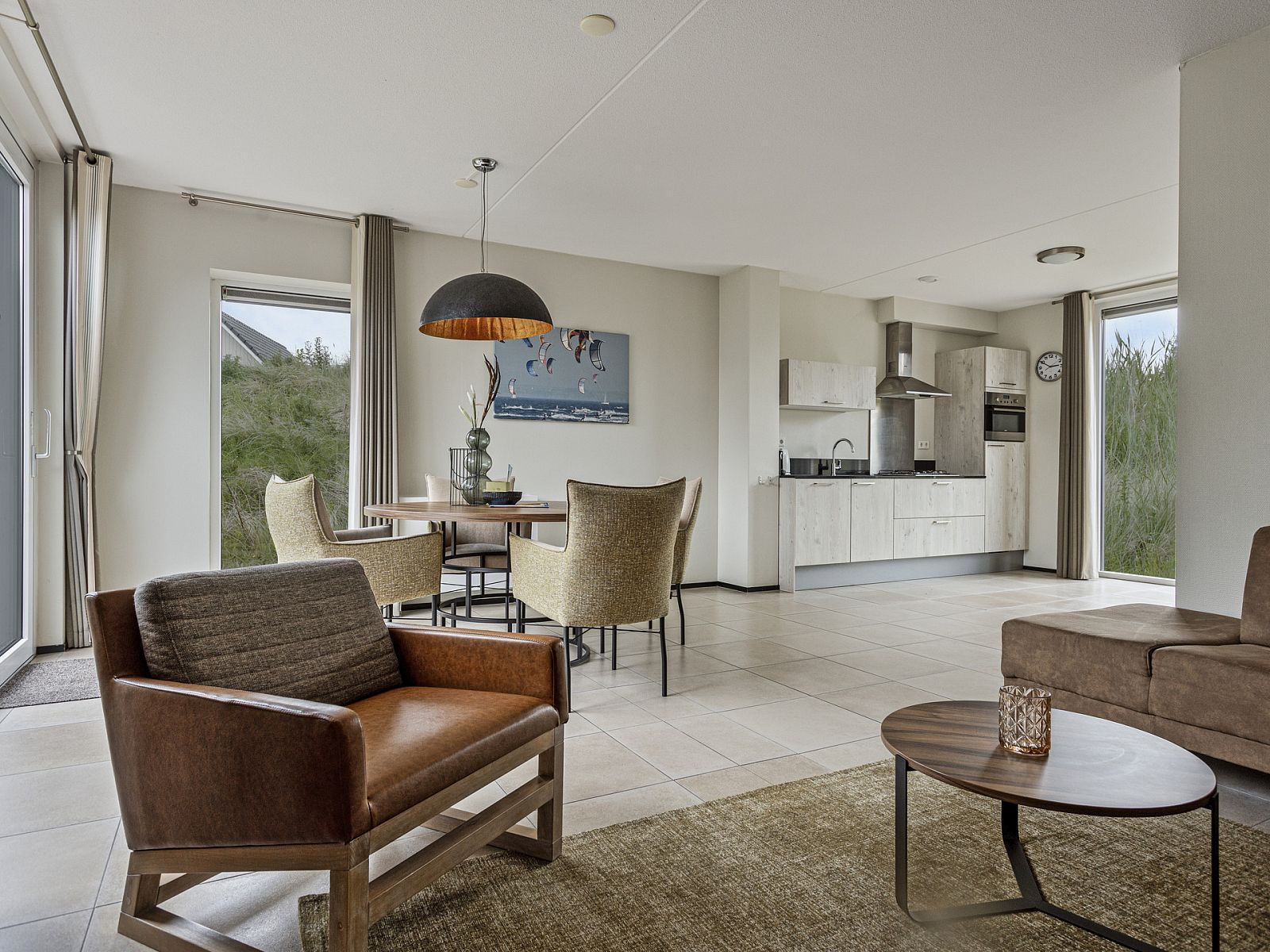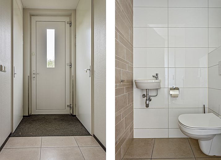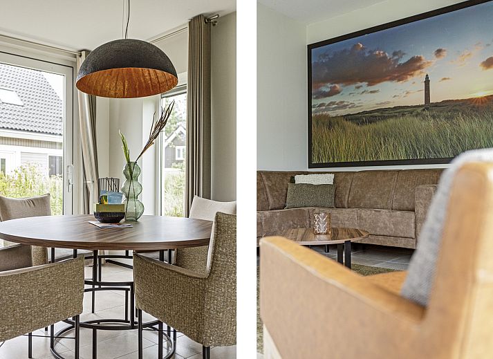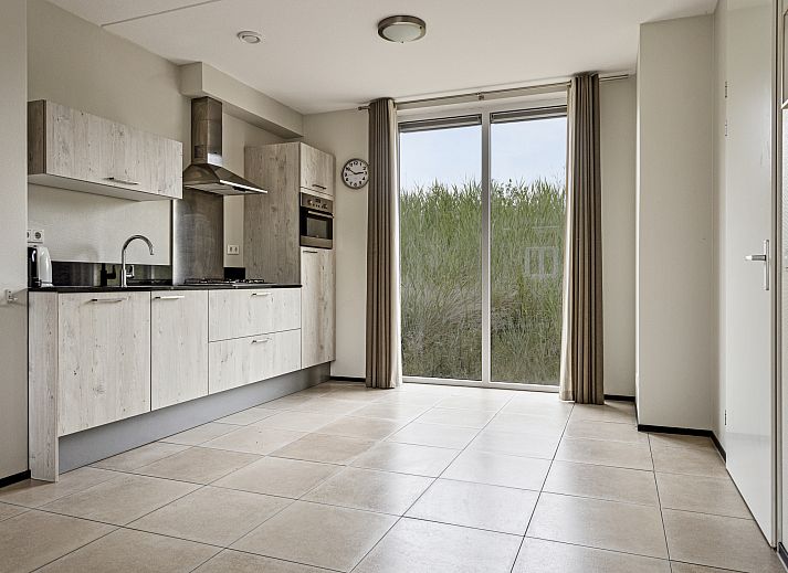 Entree met aansluitend een toilet met fonteintje, trap naar de eerste verdieping en doorgang naar de woonkamer. Vanuit de gezellige woonkamer met open keuken heeft u een direct uitzicht op de duinen. In de moderne open keuken vindt u diverse inbouwapparatuur, waaronder een vaatwasser, combimagnetron en een koelkast met vriesvak.