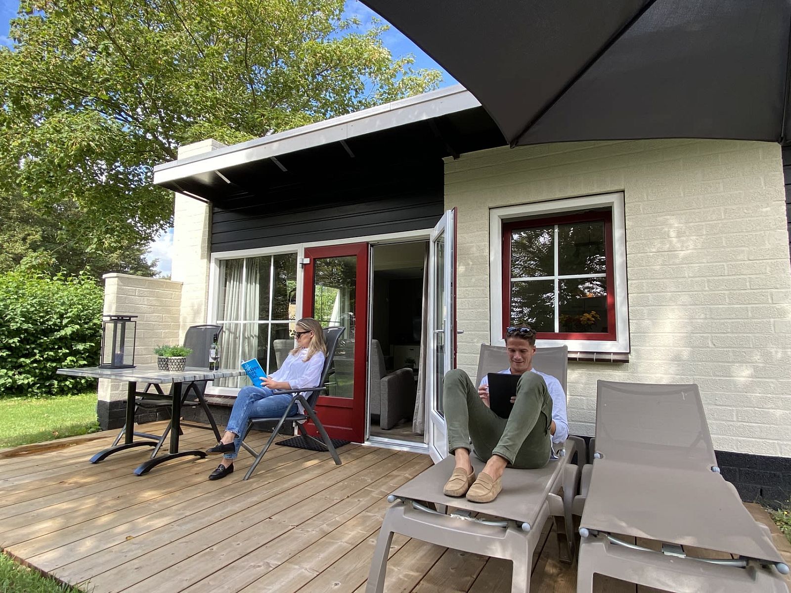 Depuis le salon, les doubles portes-fenêtres donnent un accès direct à la terrasse orientée au sud. Vous pourrez y profiter du soleil même au début du printemps. Vous pouvez garer votre voiture dans le bungalow.