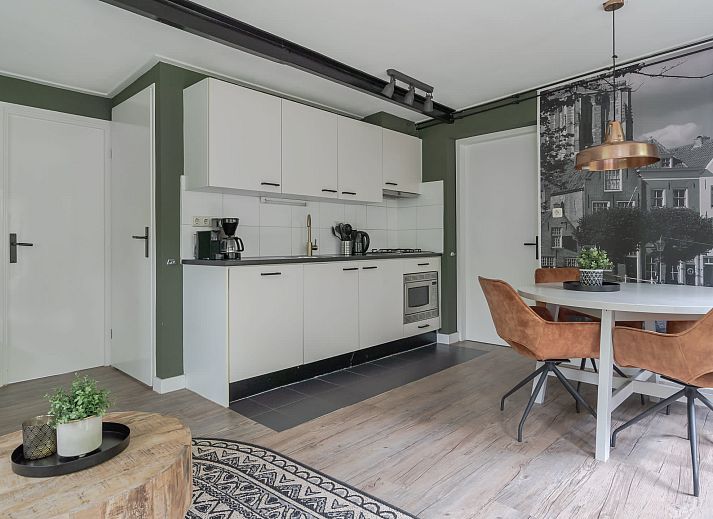 Le bungalow dispose d'une cuisine moderne équipée d'une plaque de cuisson à 4 feux, d'un réfrigérateur avec compartiment congélateur, d'une cafetière à filtre et d'une machine à expresso, d'un lave-vaisselle et d'un four à micro-ondes. Le coin repas peut accueillir quatre personnes.