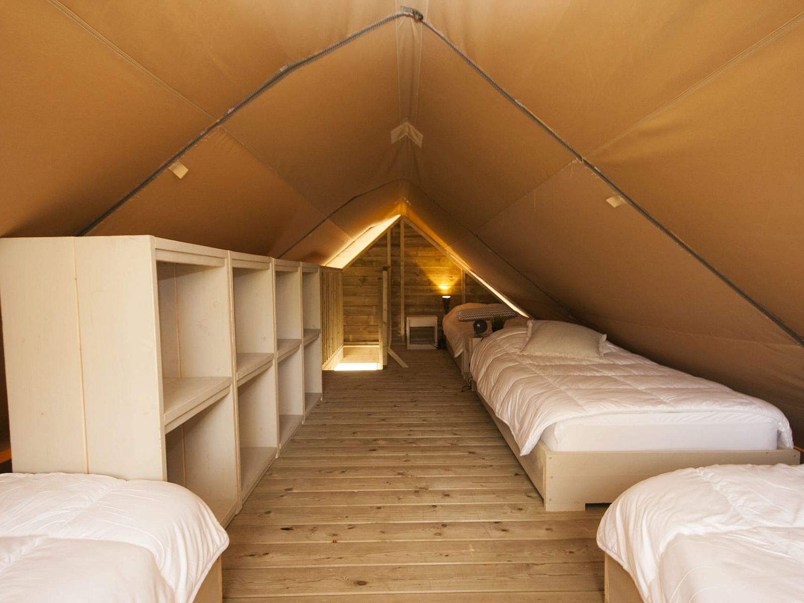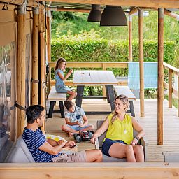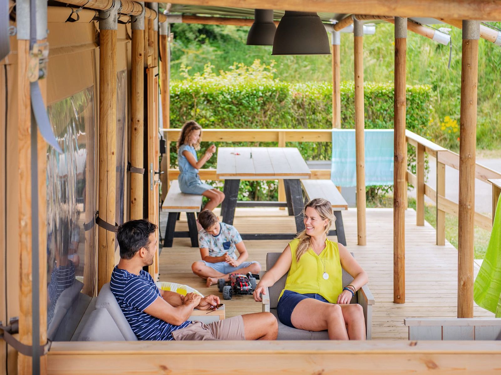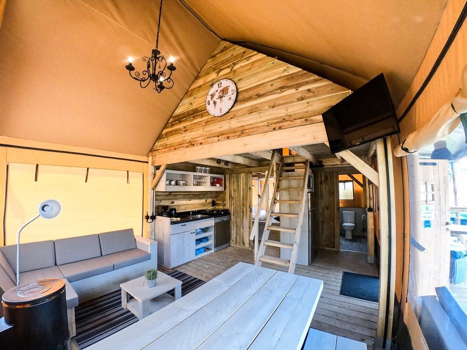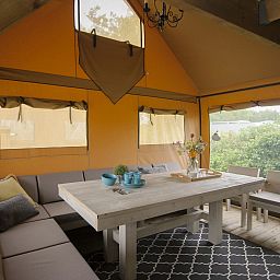 La tente safari dispose d'un canapé et d'une grande table à manger. Le salon confortable avec cuisine ouverte donne une impression d'espace où tout est présent. Il y a également un chauffage électrique pour une chaleur agréable.