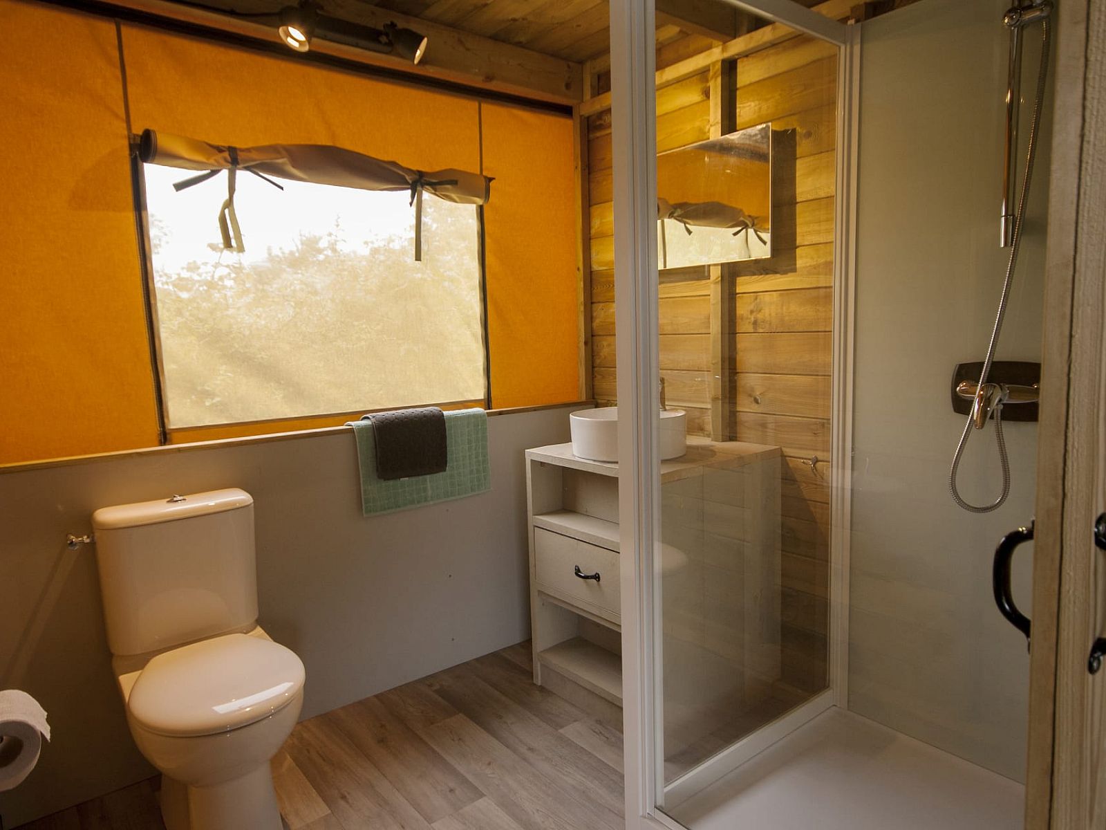 La salle de bains est équipée d'une douche, de toilettes et d'un lavabo.