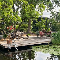 Dans notre jardin d'agrément se trouve la grange restaurée datant de 1900. En vous promenant, vous pourrez admirer tous les oiseaux et l'étang qui regorge d'insectes. Le jardin vous ouvre l'esprit et vous procure une sensation agréable et réconfortante. La grange est située entre les pépinières du village de Hazerswoude, au bord du Padesche Wetering. Sur la terrasse au bord de l'eau, vous pouvez vous détendre, le temps semble ralentir et peut-être apercevrez-vous un martin-pêcheur passer. La grange, reconstruite avec amour et pleine de caractère, respire le passé et offre tout le confort moderne pour un séjour relaxant. Au rez-de-chaussée, vous trouverez une cuisine bien équipée, avec une plaque à induction, une cafetière Senseo et une bouilloire. À côté, vous trouverez des toilettes, une salle de bains spacieuse avec lavabo et douche à l'italienne. Les portes-fenêtres vous invitent à sortir, tandis que les fenêtres tout autour estompent la frontière entre l'intérieur et l'extérieur. L'escalier vous mène au premier étage où les anciennes poutres embrassent l'espace, le lit double et le lit jumeau dans le lit-clos vous procurent un sentiment de sécurité.