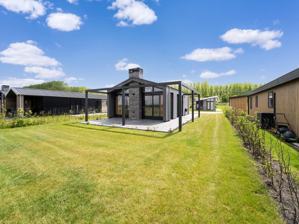 Ce cottage contemporain offre calme et nature. De grandes fenêtres illuminent l’espace et dévoilent les roseaux et l’eau. Les tons chauds, le salon cosy et la cheminée décorative créent une ambiance accueillante. À l’extérieur, la terrasse en bois et la pelouse au bord de l’eau invitent à des soirées paisibles avec vue sur les prairies et les Kaagplassen