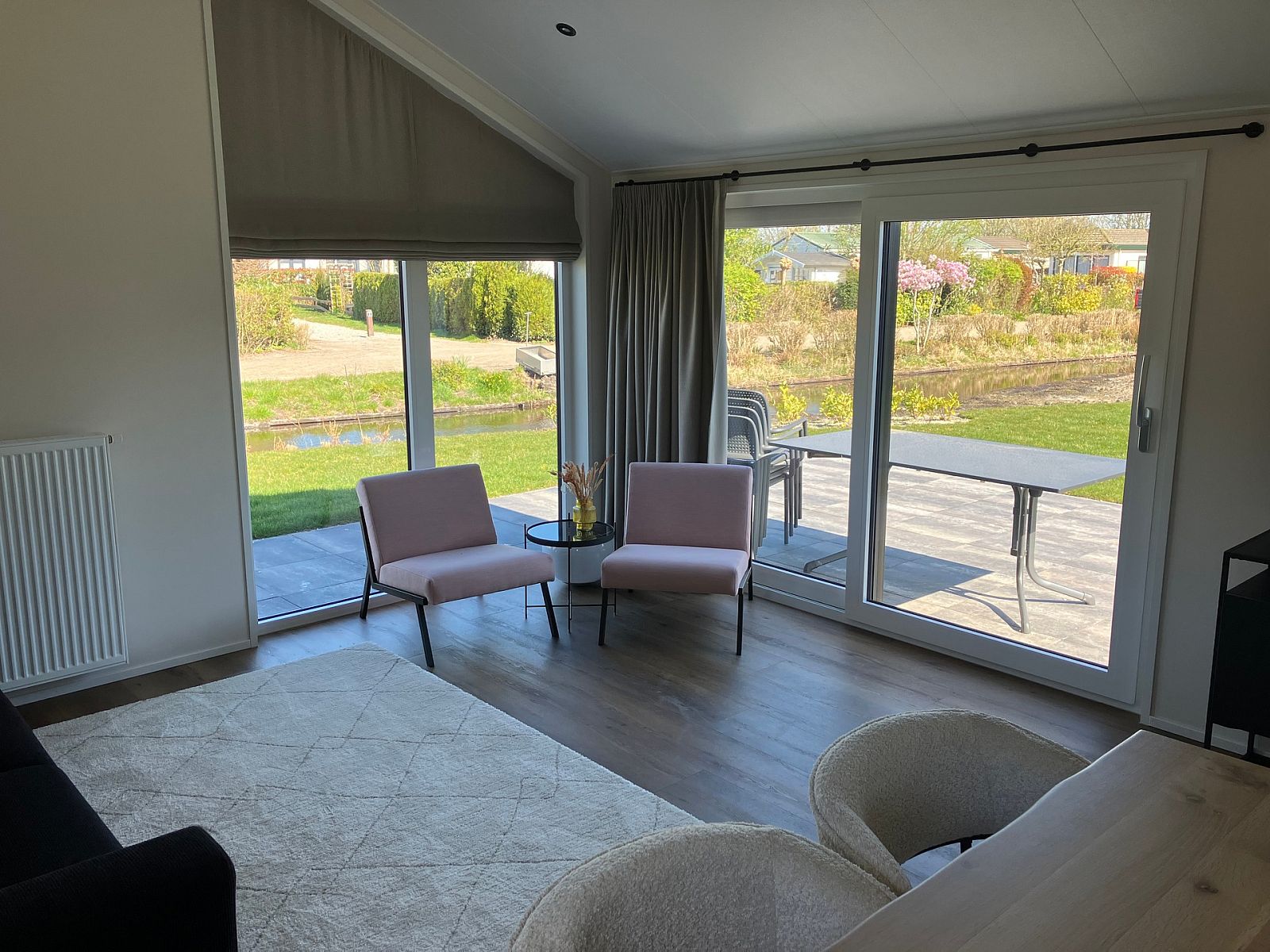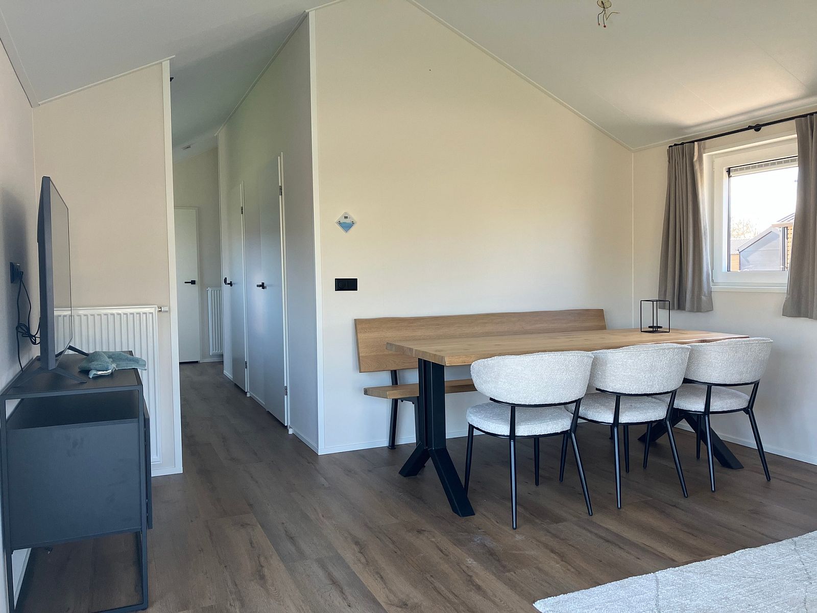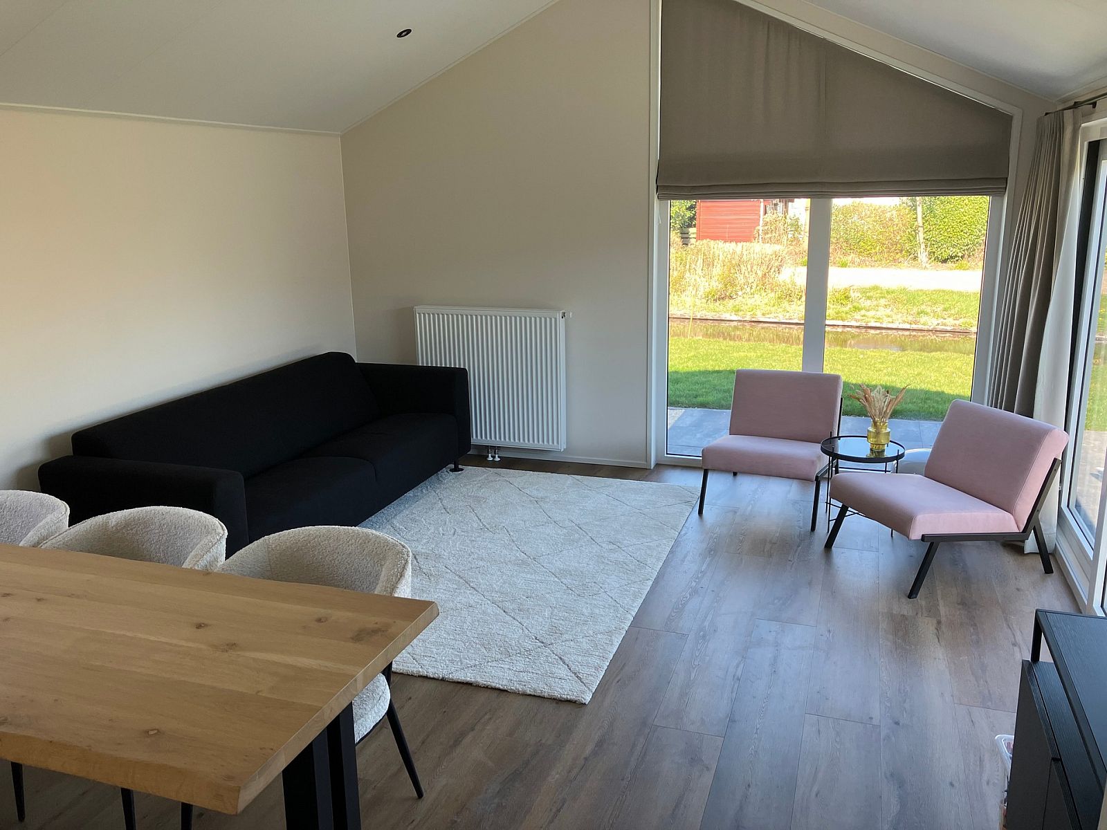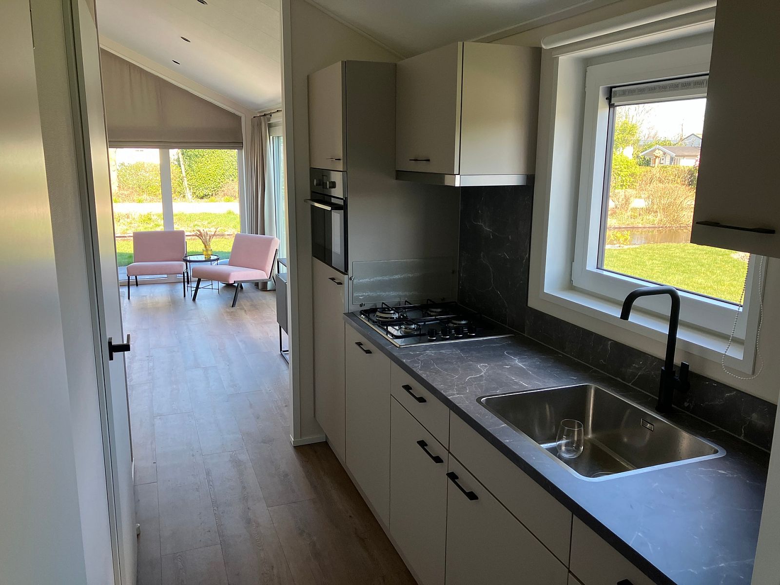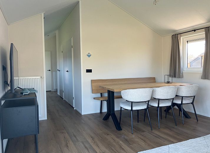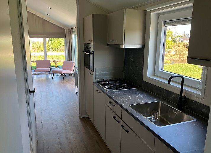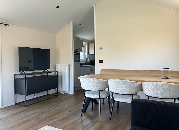 De open woonkamer straalt gezelligheid uit door de grote raampartijen die volop natuurlijk licht binnenlaten. Hier vindt u een comfortabele zithoek, een eethoek en een moderne open keuken. De keuken is volledig uitgerust met hoogwaardige apparatuur, waaronder een koelkast met vriesvak, combimagnetron, vaatwasser en een fornuis met afzuigkap.
