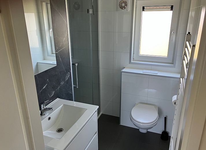 De badkamer is modern ingericht met een toilet, ruime douche, designradiator en wastafel met spiegel. Dankzij de wandpanelen in plaats van betegeling is deze badkamer makkelijk schoon te houden en relatief onderhoudsarm.
